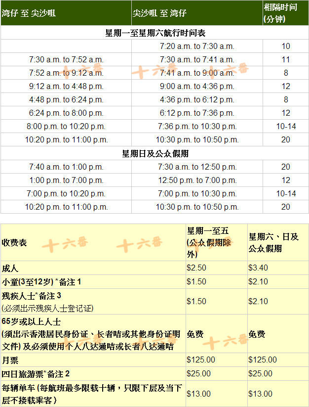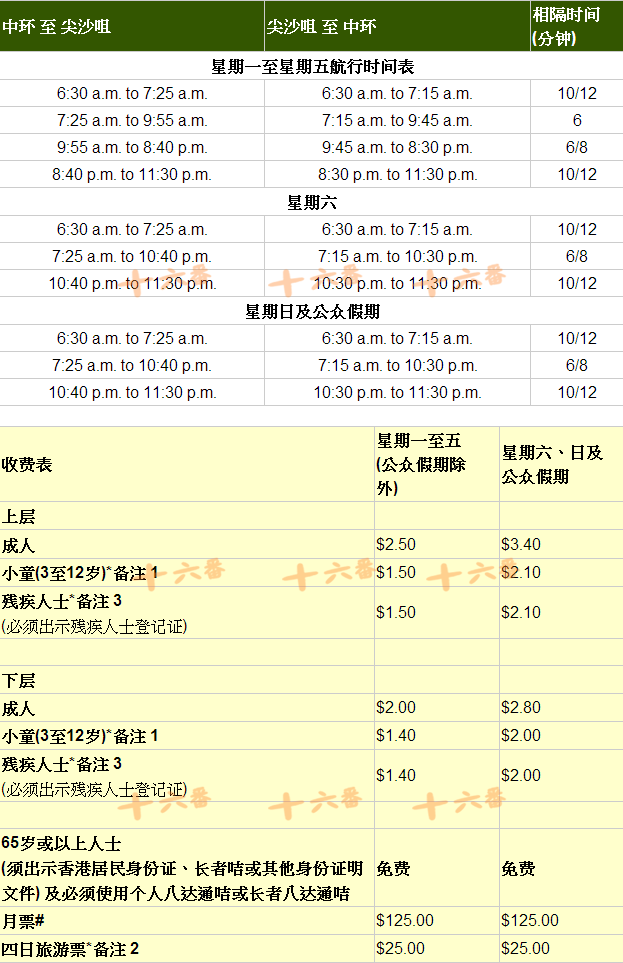 9、天星小轮,就是水上巴士,其实不止这个水上巴士,但是观光的话这个最出名,特别是晚上可以看到维港夜景。只有2条航线,一条是中环---尖沙咀,另外一条是湾仔---尖沙咀。晚上推荐湾仔到尖沙咀这条线(详细可以看下面景点攻略),早上可以坐尖沙咀到中环去喝早茶或者吃饭(下面美食攻略)。下面附具体时间表。刷八达通可以进,隔壁也有售票机,票价都好便宜几块钱而已。一般都是在二层,上船要马上找靠窗位置,船头船尾是有空调的不过也有玻璃,建议坐中间,没有玻璃比较好拍照,而且开船后也有海风挺凉快的。要说不好的一点就是码头有点难找,一般通往码头的都是天桥,特别是湾仔码头,不能走马路到达只能跟着指示走天桥,而且标识还不是很明确,上天桥后看到往游泳场或者地铁或者海的方向走就可以。另外一边就是金紫荆广场,码头二楼好像也有观景台。