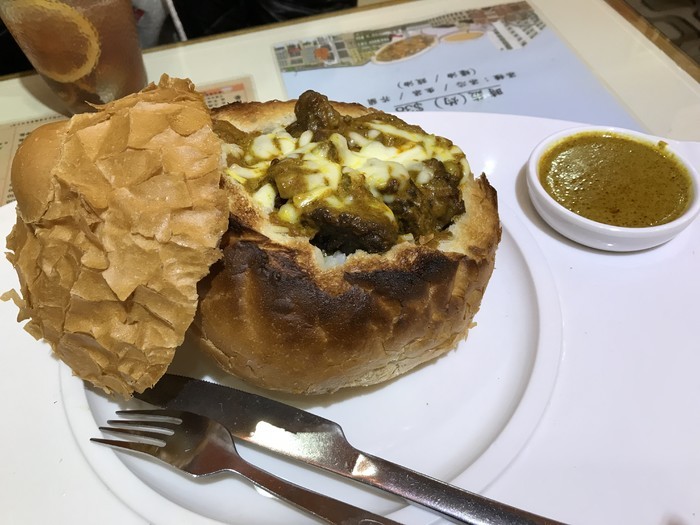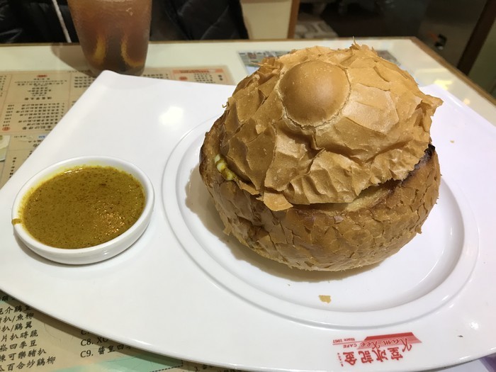 咖喱牛腩农夫包 :(其实是不知道农夫包是什么才点的,农夫包就是面包里面是咖喱牛腩焗饭),挺好吃的,咖喱牛腩有点辣上面有点芝士下面是饭, 外面的包也是可以吃的,不过我们有点饱了只吃了牛腩和饭。