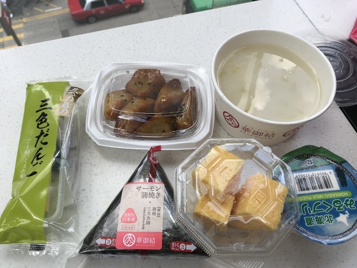 20、华御结,卖日本饭团和小菜的便利店,没有堂食只能外带,这个我在尖沙咀吃的,店员说可以上三楼去星巴克外面玻璃窗吃,观景挺好的,对面是重庆大厦,还看到下面鹿角巷超级多人排队,鹿角巷我在广州的分店有喝过,不知和香港是不是一样,说真的味道自己都能做出来,就是黑糖酱+鲜奶。