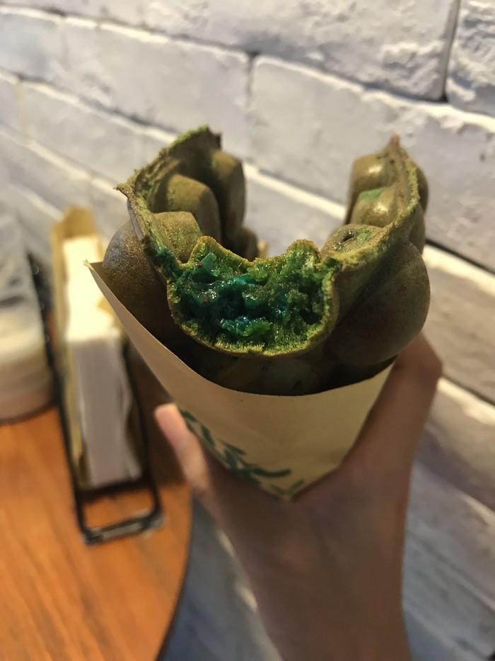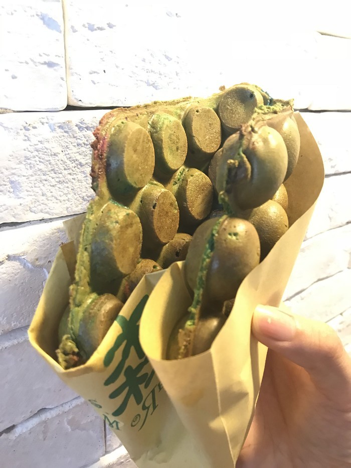 抹茶口味鸡蛋仔+m&m : 说真的不怎么好吃,虽然馅料很扎实,皮的位置也很脆。但是好甜,没什么鸡蛋仔味道,先是抹茶味带点甜然后都是超甜的m&m味道,可能普通款会好吃吧。