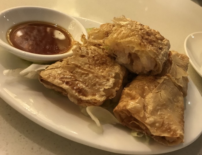 鲜虾腐皮卷 :挺特别挺好吃, 就是用腐皮包着鲜虾炸,旁边的酱汁也很搭,推荐