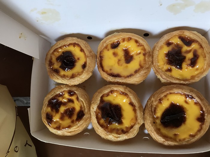 2.玛嘉烈蛋挞店和安德鲁蛋挞店,传闻中最好吃的两家,而且这两家还是一对夫妇离婚后开的,估计味道差不多,玛嘉烈位于澳门半岛,安德鲁在路氹。(玛嘉烈在巷子里,不在马路面,跟着导航走到红绿灯附近的拐角处就看到指示牌),排队进店买,虽然门口有桌椅提供,不过基本是外卖包装。