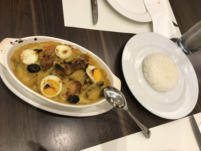 焗葡国鸡:味道还可以,看着像咖喱鸡,但没什么咖喱味道,鸡肉挺多的,配了白饭。