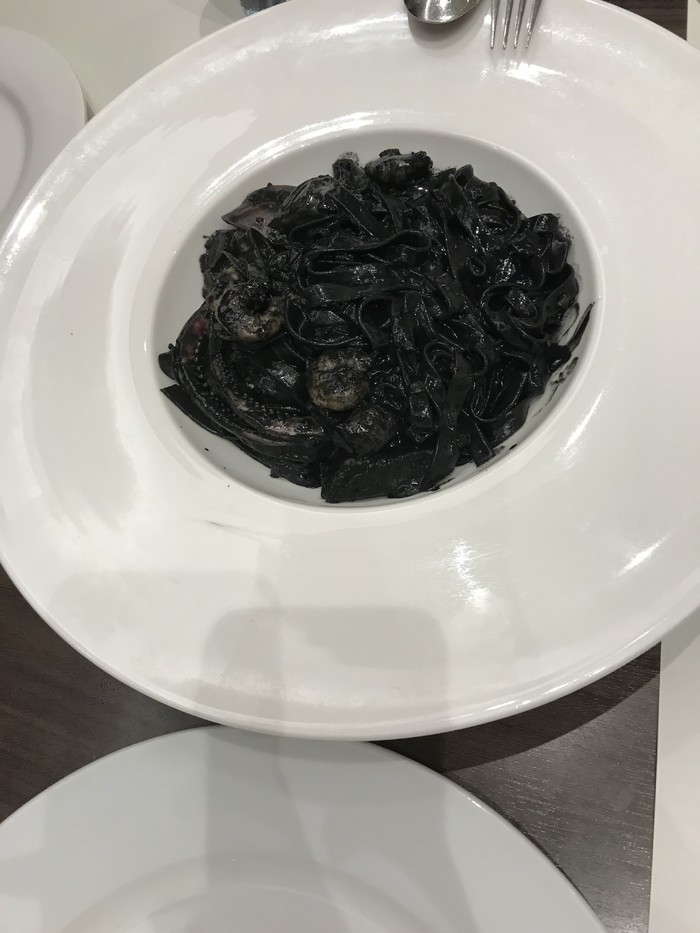 墨鱼面:里面最合我们胃口的一道菜,大家都喜欢,海鲜料也很足。不过墨鱼面也很难做得难吃,像萨莉亚这种快餐店的墨鱼面也好吃。