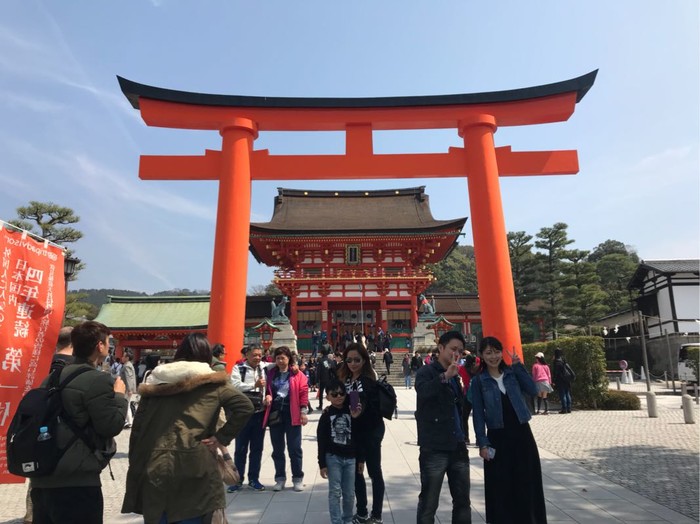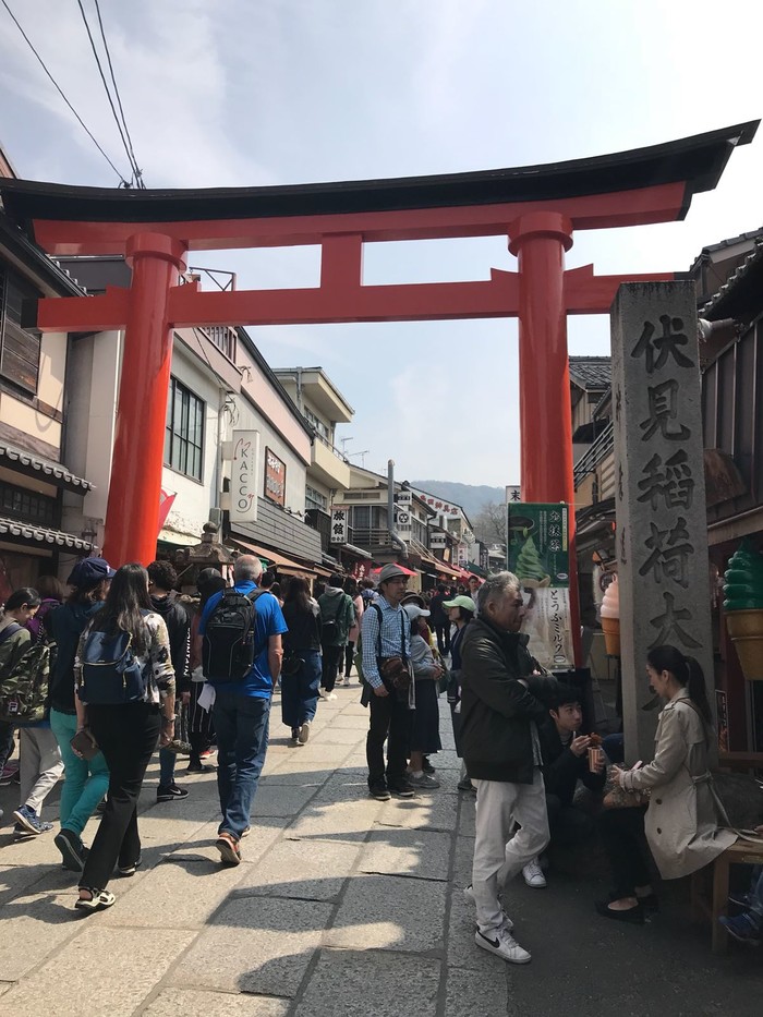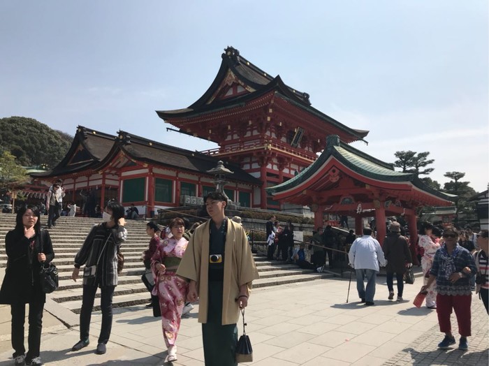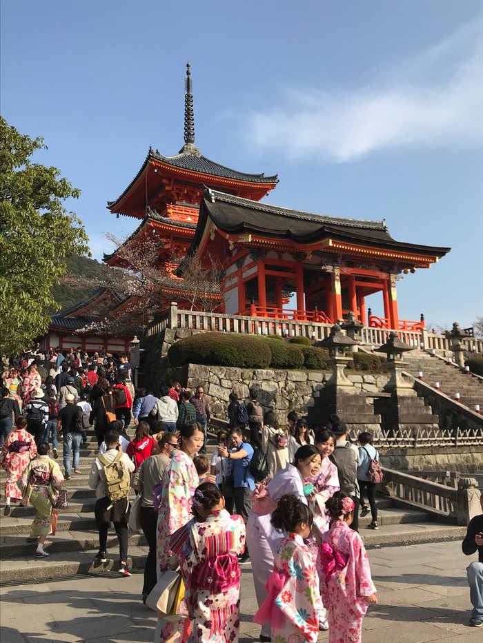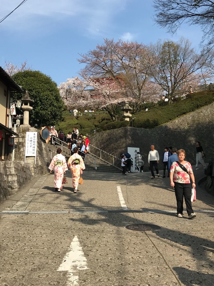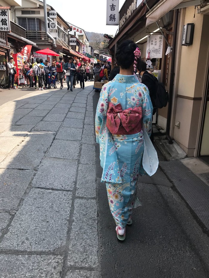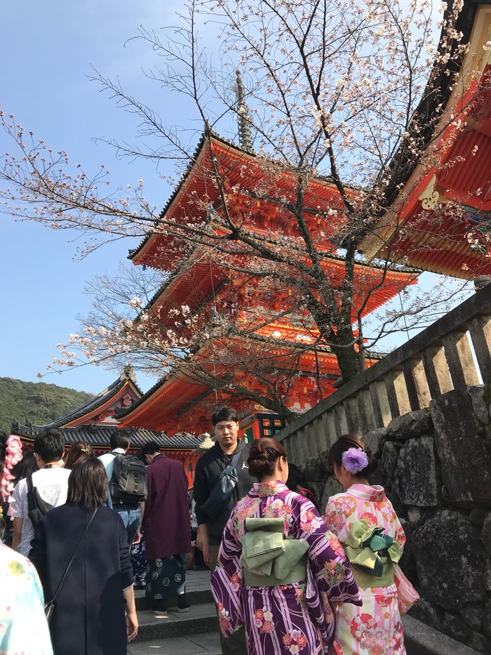 今天要比前面一天要早一些出门,我们要去京都玩,用的是京阪电车一日游券,坐地铁去伏见稻荷大社,在伏见稻荷大社的门口一家和服店提前网上预约了和服租赁,本来说好两人一起穿和服的,但是由于我在其他人的攻略游记中说到这个和服穿上后腰肚子这块会特别的勒而且穿木屐走路特别累,所以本来我打算穿的话也只穿一个伏见稻荷大社,穿完就还还能定定心心放松的吃中饭,但是兔子表示一样都花了这些钱穿一会会儿就还不划算她要穿一天到其他的分店还衣服,我考虑再三还是决定放弃不穿了,最后就变成兔子一个人穿和服负责美美的,我就当她专属摄影师负责拍照的,今天又是一天大暴走,从伏见稻荷大社开始,坐地铁去清水寺,下了地铁又是一路走,爬山上清水寺的途中随意找了一家小店把中饭先解决了,我们俩一人点了一碗类似盖浇饭,这娃不听我的吧,本来被和服弄得又累又勒的,还要跪坐在榻榻米上吃饭,本来一碗饭分量就没有很足,这下好了只吃了三分之一就吃不下了,吃完饭一路爬山清水寺再从清水寺一路走下来,上去一条路下来走另一条路,然后走过三年坂二年坂,沿街走到八坂神社再到祗园,到了祗园先找租和服的分店换了衣服,再到花见小路,穿过小路转到一家京都老牌专做豆腐的料理,点了一份豆腐怀石料理和一份豆腐火锅料理,人气不错哦我们出来发现排长队了,再一路返回走到地铁站,坐地铁回大阪,出了地铁站又去超市里买东西,回民宿后这娃因为今天受苦受累了去附近泡温泉的地方泡温泉去了,我留在民宿里整理东西顺便洗漱,等兔子回来了吃夜宵,今天的夜宵是樱花樱桃酒配寿司
