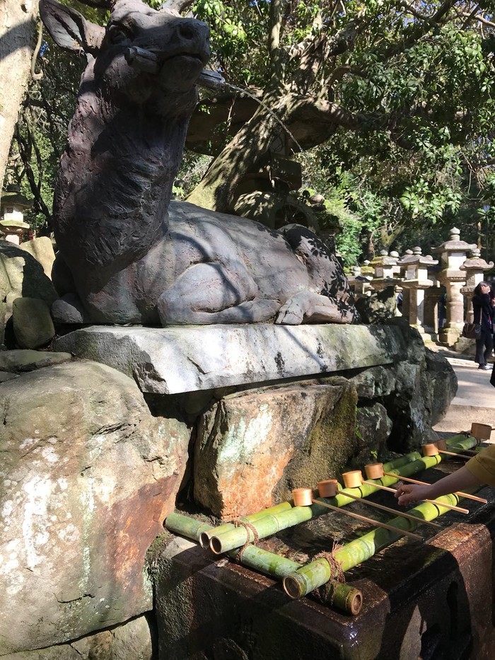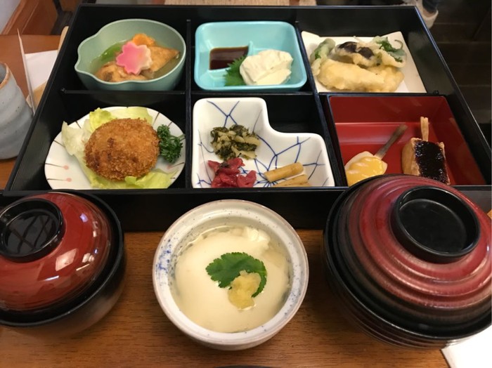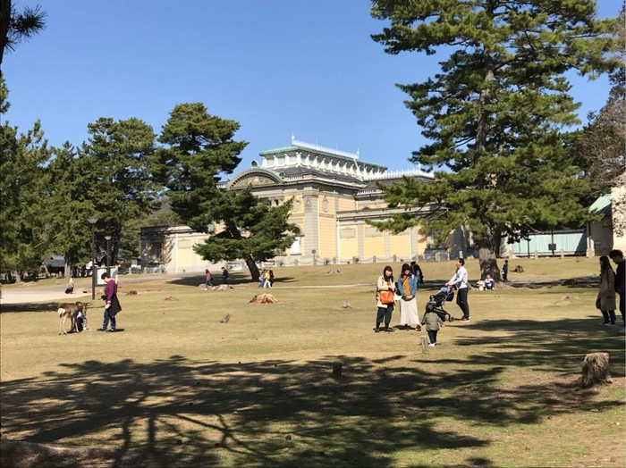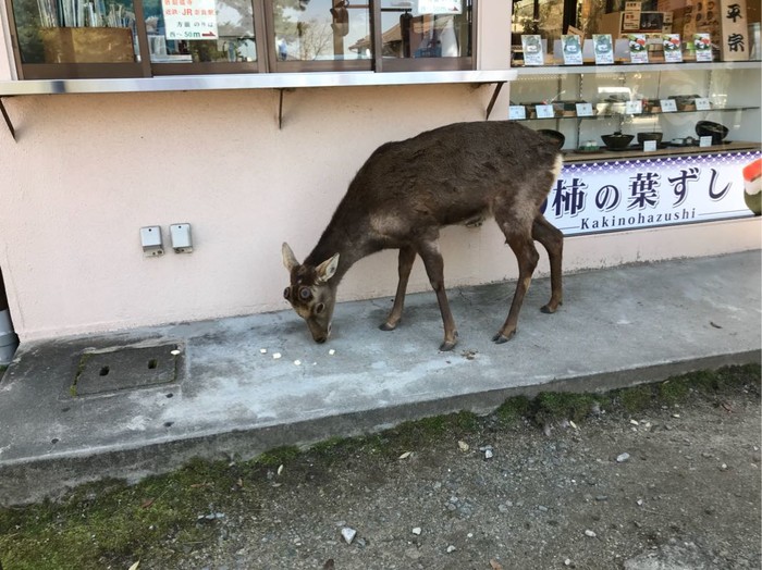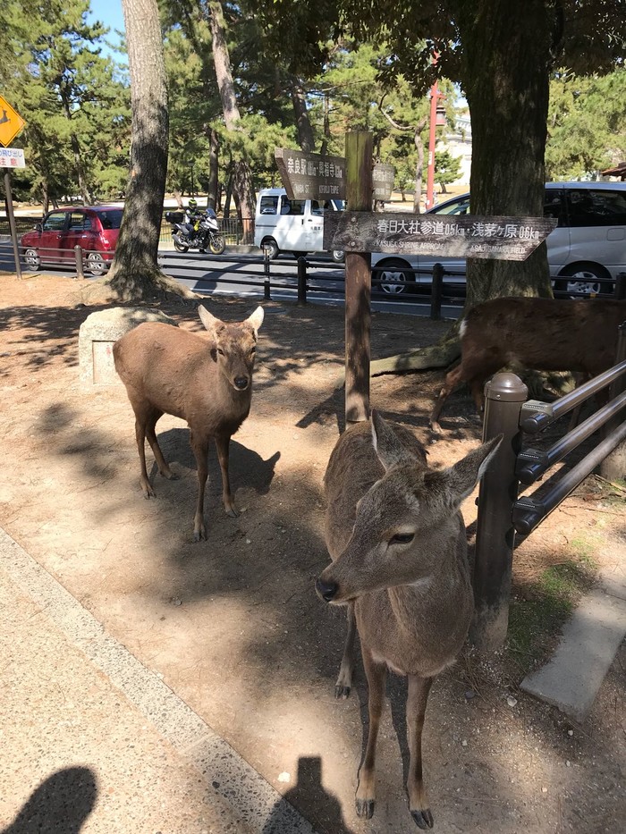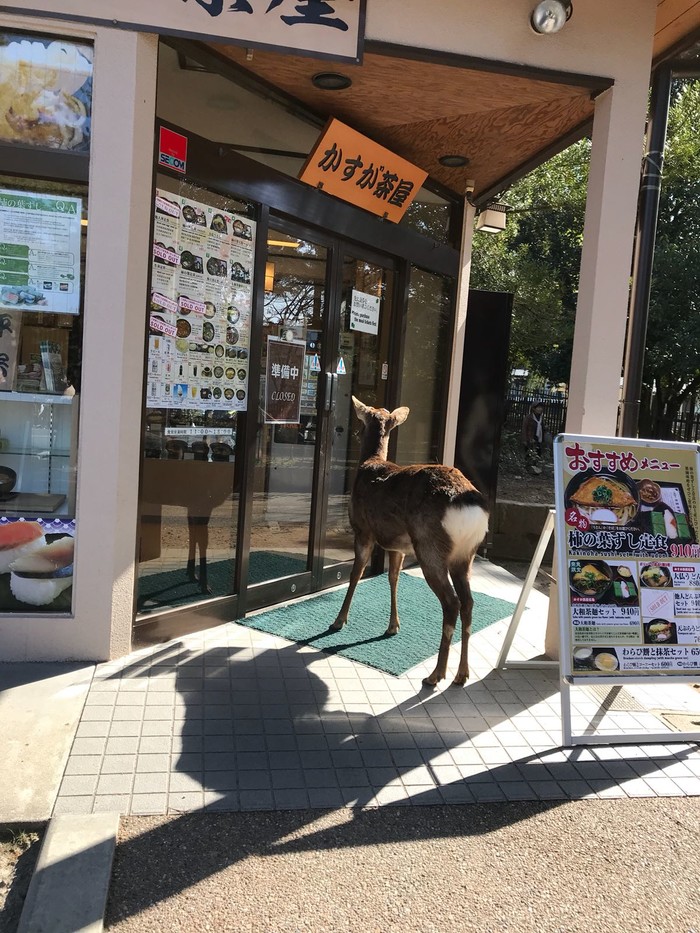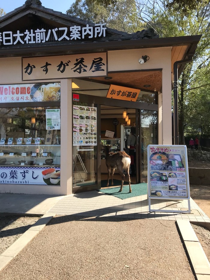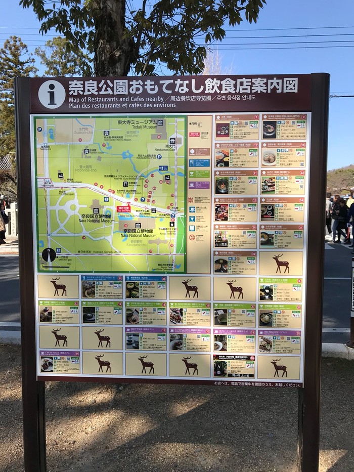 安全抵达霓虹国后,各种安检入境按指纹后拿了行李,自己玩自助售票机买票坐车去奈良,吭哧吭哧的历时一个多小时终于到奈良,先在奈良的地铁站里面寻找可以寄存行李的存储柜,哎呀600日元一个大箱子非要我100日元100日元的扔进去,急急忙忙的去买了瓶水把大钱找开来去寄存了后去吃午餐了,点了两个定食解决温饱问题