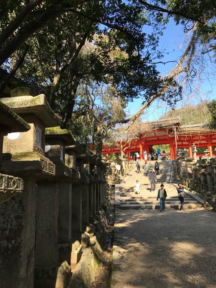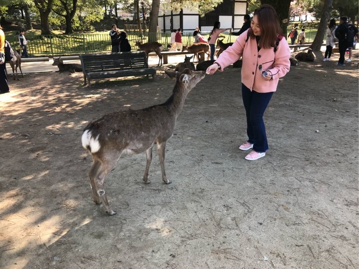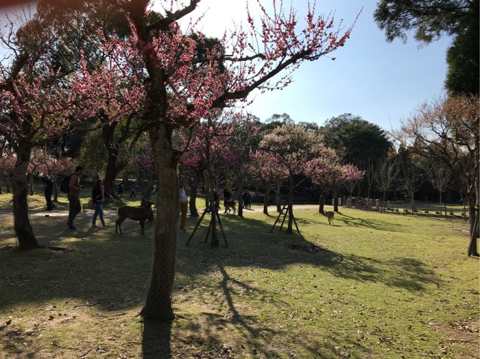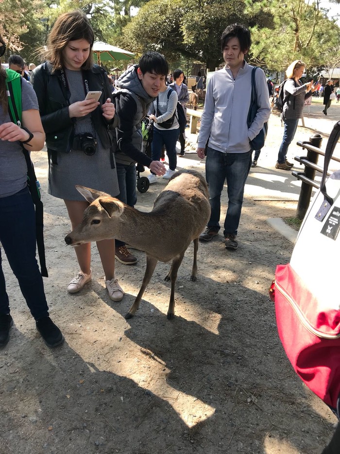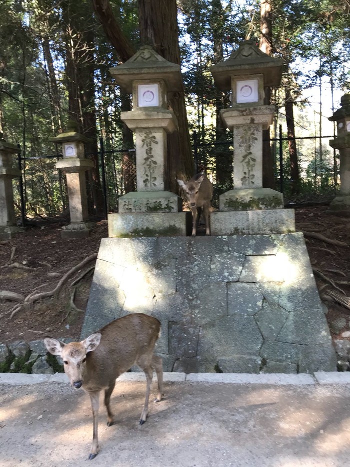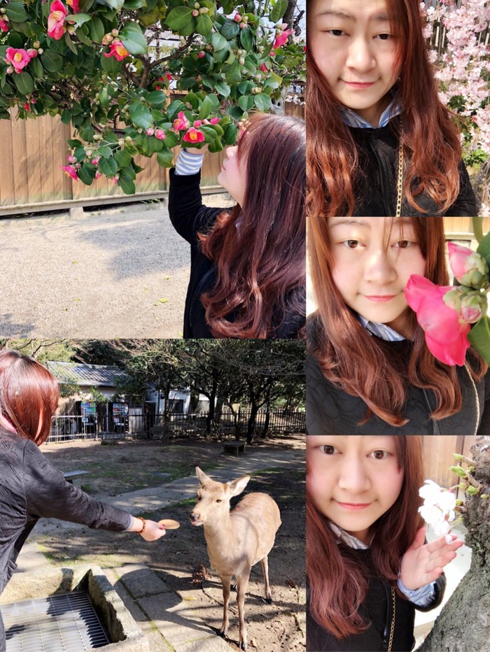 吃完中饭就去奈良公园去看奈良小鹿了,不知道我们去奈良的时候是樱花已经谢了呢还是还没有开,樱花特别少不仅是树少开的花也少,特意买了鹿饼喂小鹿,遇见了会鞠躬讨吃的小鹿,也有调皮捣蛋欺负小朋友的小鹿,也有穷追不舍的小鹿,还有小小的可爱的小鹿,沿着公园外围一路走至春日大社,路上还看见了一只在商店门口鞠躬讨吃的小鹿,店员也很有爱心的给它丢了一小块卷心菜,在春日大社里还看见了一对在拍婚纱照的新人,然后各种大暴走寻找某只要看的什么古遗迹,再然后又是一顿暴走说是回地铁站坐地铁去大阪,这货领着我走了大半天,还好我多嘴问了一句,不然她准备坐其他线的地铁线路去大阪了,完全忘了我们还有行李寄存在某个地铁站里面了,吭哧吭哧的终于到了大阪,地铁站一出来就看见一家大型超市,两人决定先去找民宿,安排妥当后再出来吃晚饭和逛超市,匆匆忙忙的放好行李稍微的休息了一下就出门找晚饭吃了,晚上7点这边商场里好多店都已经打烊了,要么就是我们想吃的店只卖乌冬面其他的都卖完了,所以最后找了个卖咖喱乌冬面的店,两人各点了份不同的咖喱乌冬面吃,然后去楼下的超市逛逛,买了好多零食和冰激凌,回民宿再吃夜宵,今天夜宵吃的是梅子酒配蒲烧鳗鱼,然后轮流洗漱准备睡觉觉了