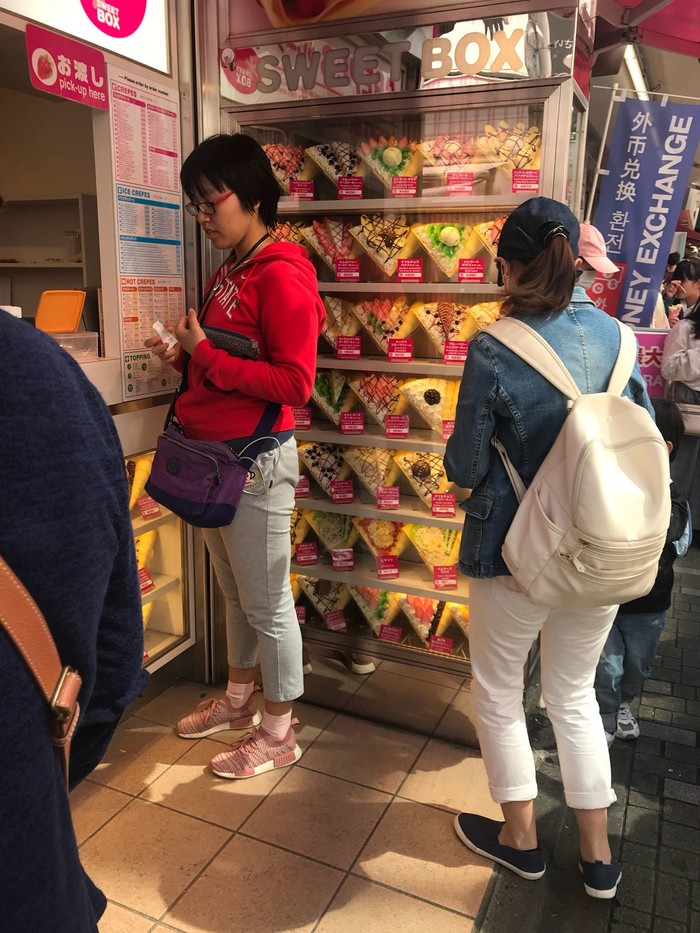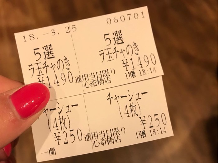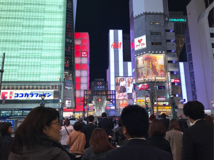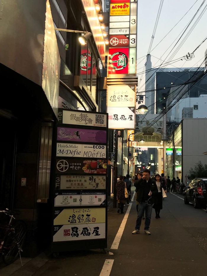 晚饭去吃一兰拉面,特意去心斋桥那边的店,排队的人没有道顿堀的人那么多,然后门口一兰拉面是门口的自助点餐机自己点餐,一个是妹子们没玩过这机器还有就是妹子们没吃过一兰拉面,导致两人点完餐发现可能点多了,再然后就是吃饭的时候还闹了个乌龙,一兰拉面进去吃面都是小隔间,桌边有个小挂钩,我想着我也不脱外套衣服么手提袋就直接挂小挂钩上,然后在上菜的过程中兔子说要喝可乐,我就从手提袋里给她拿了可乐,喝完了又给我放好了,等菜都上齐了我发现我怎么只有勺子,我就问兔子了他们给没给你筷子吖她说给了,然后我就帮她说我没有筷子,她帮我问服务员拿了双筷子,吃完了一兰拉面后在附近的心斋桥逛了逛,发现这边的店好多也6点多就开始关门了,几乎就只有药妆店和美食店开着,只能去药妆店逛逛,逛了几家药妆店,她手上已经拿了好几个袋子重死了,我是腿酸都快走不动路了,然后体验了一把日本的taxi,打出租车回民宿