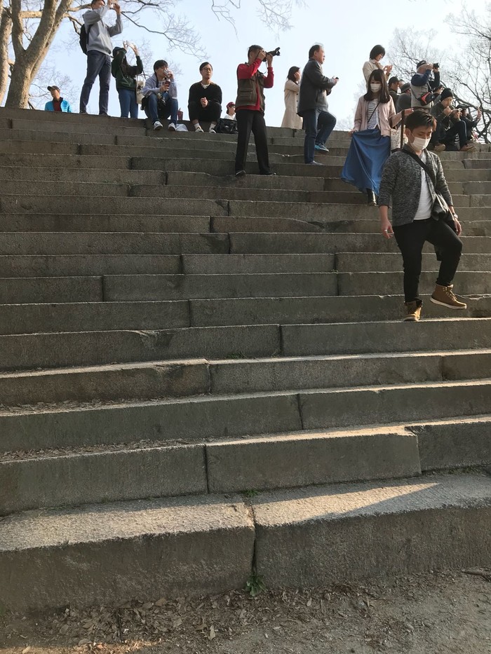 大阪城这边的地铁站出来有个很大的公园,然后沿着人流爬山上去看山顶上的天守阁,半路看见一个大台阶,好多旅游团导游带他们到这边台阶让她们自己上台阶拍照片,说是这地方是拍天守阁远景的最佳取景点,一路爬上去看风景再一路爬下来,上去的时候走了一条道,下去的时候走了另一条道,我觉得下去的道要比上来的道要漂亮,然后坐地铁去心斋桥
