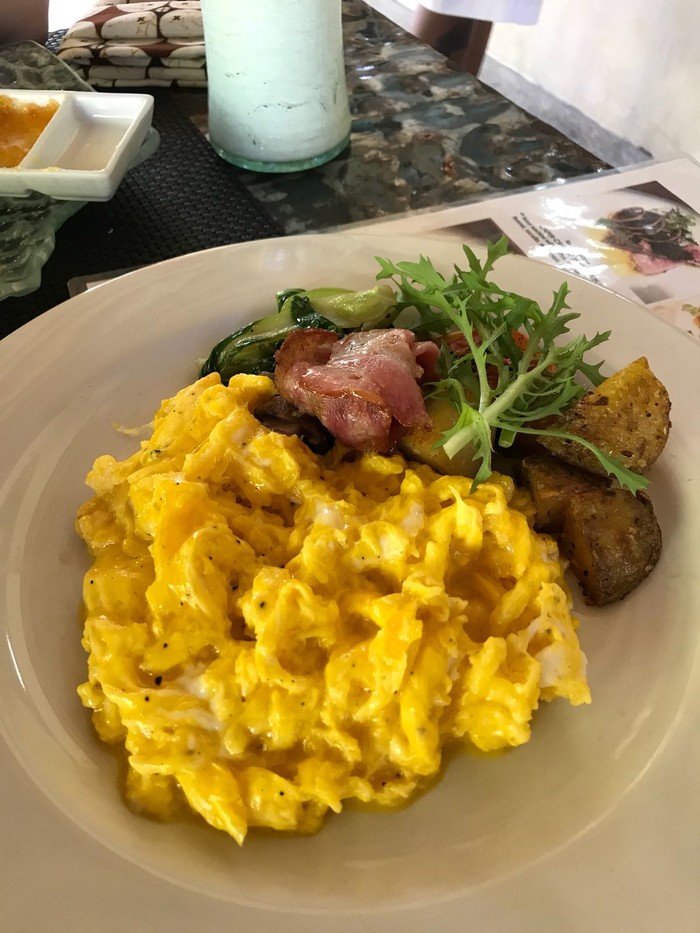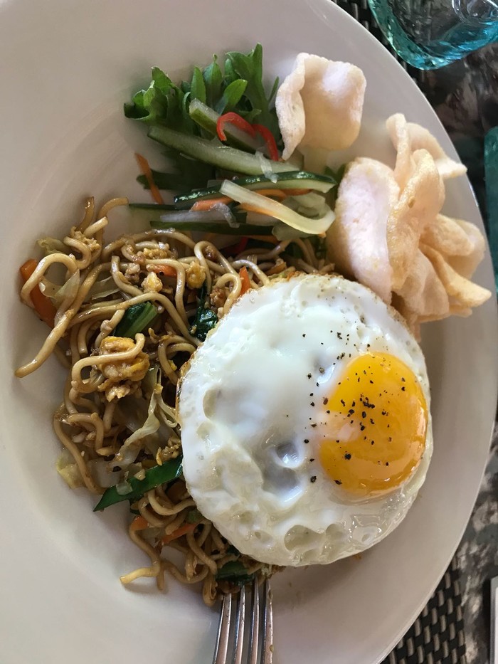 买了酒店的配套早餐,服务员在问是要湿散蛋还是整蛋时略搞笑,因为我英语也不是特别好,最后服务员加上肢体语言,我才懂,哈哈。最后是点了一份印尼炒面早餐和湿散蛋美式早餐还不错。