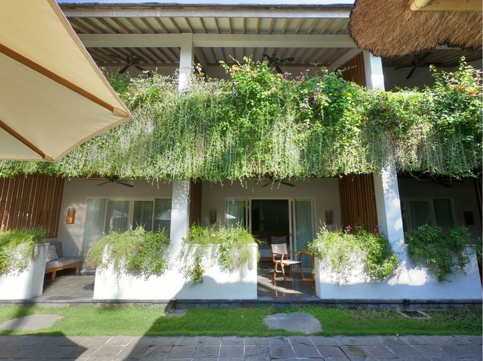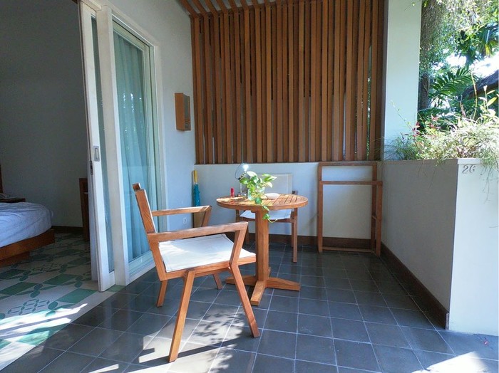 酒店环境是不错的,每个房间都会有个开放的小露台,很enjoy生活,就是那个洗手间,我觉得太小了,使用起来不是特别便利,下图右边玻璃处为干湿洗手间: