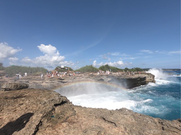 蓝梦岛的一处景点,恶魔之眼,场面是挺震撼的,海浪打上来会出现一道彩虹,就是当天人略多。