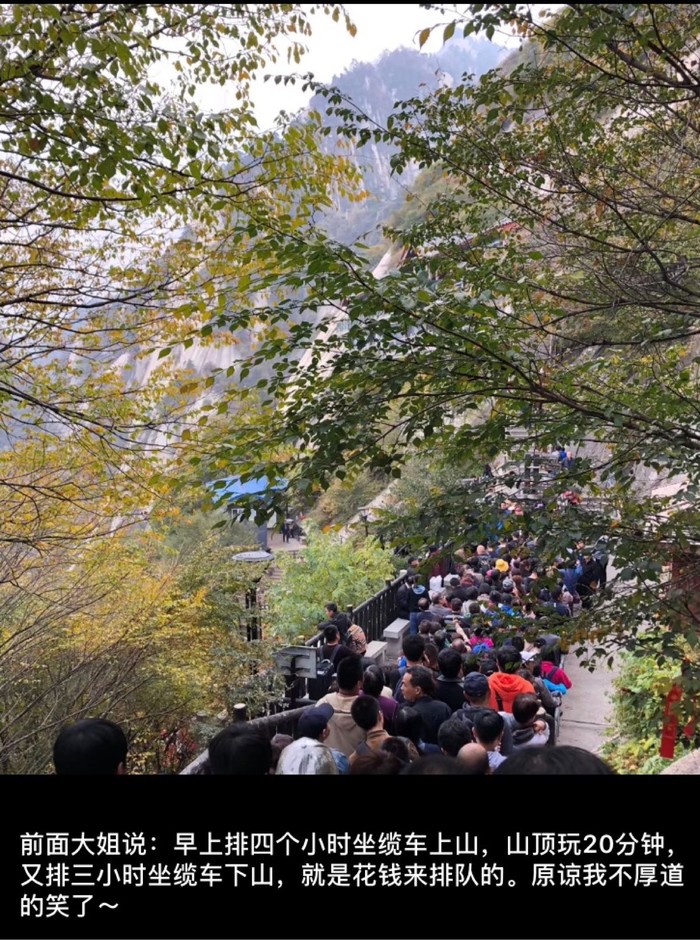 第二天和朋友报了一个华山(有东南西北中峰)一日游,北峰上,西峰下,交了500多,后来因天气原因,西峰索道停运,我们爬上去,坐索道下,后来退了我们索道的差价,总计是花费377元,华山门票160元,西峰来回索道150元,淡季是12月1日后,门票和索道都是半价,旺季超级多人,10月中旬华山上还是很冷的