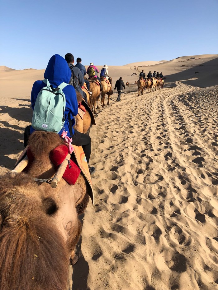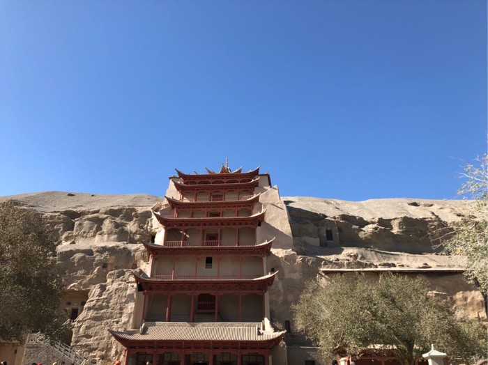 次日上午去了莫高窟,门票180,旺季是200,11月1日后90元,有教师证的只要10元。对佛教和历史有考究的,值得去,开头的两个影片震撼人生,感觉中国的文化真是博大精深。景区会安排讲解员,一般是近八个窟参观,主要是佛像和壁画,很多壁画已经氧化变黑,11月后会开放特级窟,按窟收费。