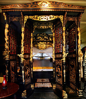 老公馆就是刘文彩的宅院,从外看,整座庄园气势恢宏,曲径回廊,高墙夹道,就像是一座黑沉沉的迷宫。从里看,屋内装饰摆设也非凡品,其中的“金龙抱柱退一步”大花床尤为夺目,檀木镶金嵌宝,龙纹栩栩如生,奢华可见一斑。