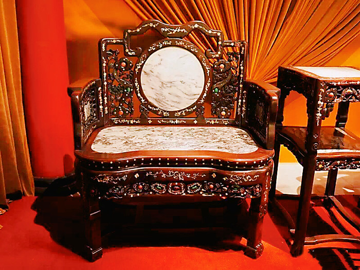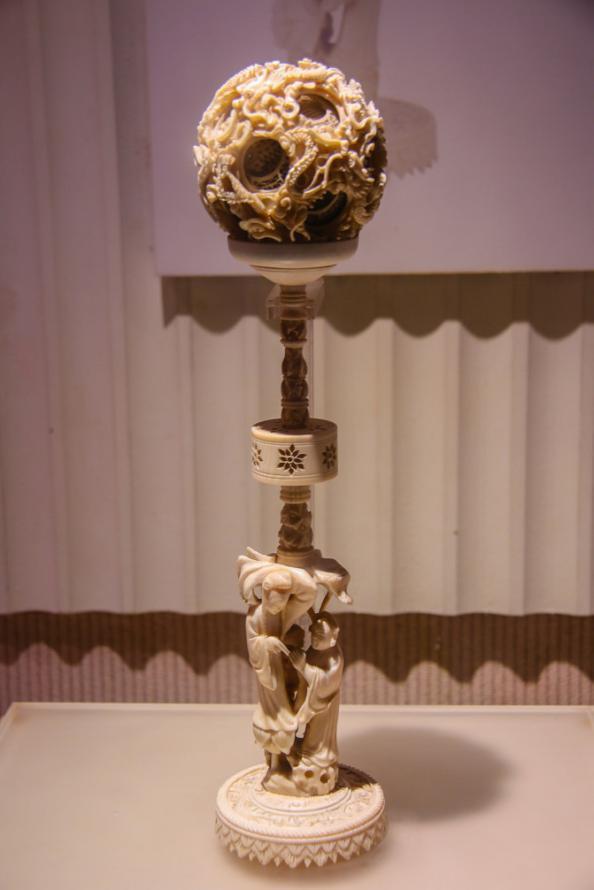 珍品馆中展出了诸多刘氏家族珍藏的珍贵文物,其中有堪称国宝级的文物,嵌27颗宝石的太平天国天王府遗物——紫檀木镶金座椅,九层透雕云龙纹带座象牙球,十三层象牙塔……