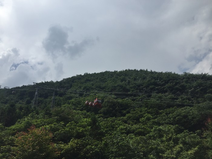 往日月坪需要坐缆车,缆车越往上走,云雾渐渐涌过来,四周一片白茫茫的,什么都看不清,又过了几分钟,云雾渐渐散开,眼前明朗起来,日月坪快到了。