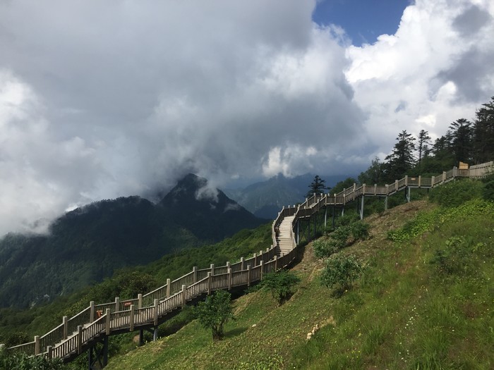 日月坪又叫三平台,海拔3000多米,空气清新通透,带着湿润的凉意。这是一个原始的世界,连绵不断的山峦起伏延伸,茂密苍翠的森林一望无际,高大繁茂的树木遮天蔽日,长长的木栈道延伸到云端。
