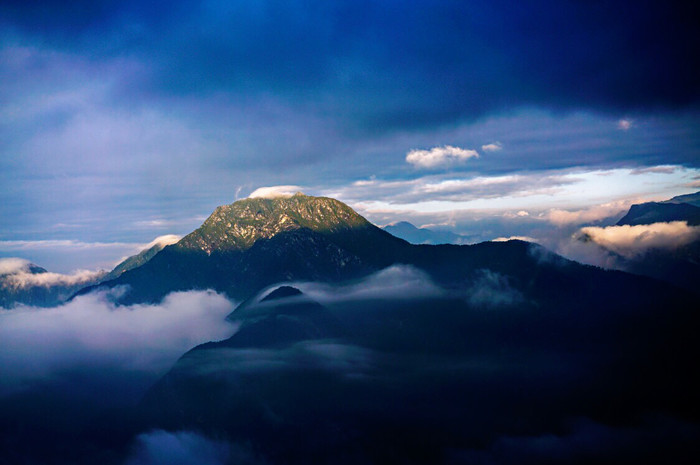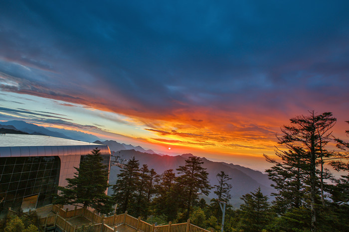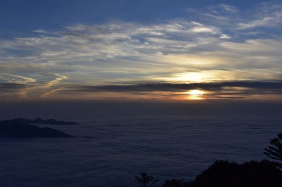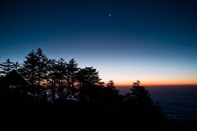西岭雪山是成都之巅,在这里可以看到撒向成都的第一缕阳光。6点起床,推开窗,东边已经泛出曙光,在云层背后冒出一点头,快要日出了。天边的曙光色彩渐渐浓烈,橙黄色的光芒把深蓝色天空和在山顶聚拢的浓雾劈开,划分出泾渭分明的界限。此时,住在山下的游客也陆陆续续赶到了。