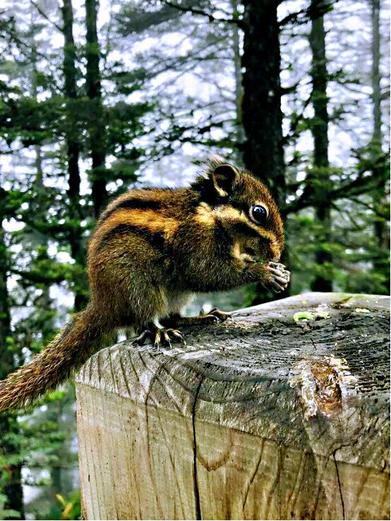 从日月坪到阴阳界还有约一个小时的路程,继续沿着木栈道往上走,途中不时出现小松鼠来和游客“打招呼”,这些小家伙窜上跳下,一点也不怕人,黑眼珠滴溜溜圆,吃东西的时候,两只前爪抱着,大板牙啃得飞快,简直萌化了。