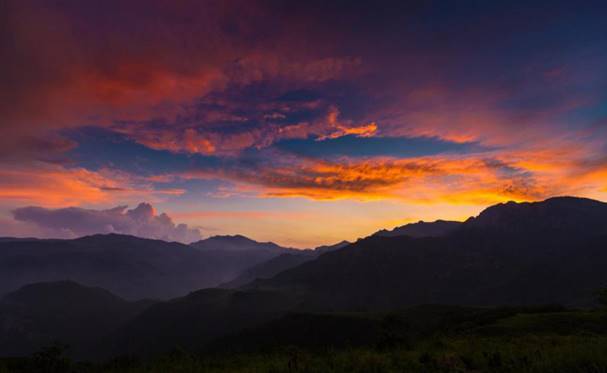 从阴阳界原路返回到日月坪,正是看晚霞的好时候,太阳已经落下去了,晚霞一开始还只是淡淡的烟霞,轻飘飘的浮在淡蓝色的天空。没过多久,颜色渐渐变深变红,就像锦缎一般铺满西岭雪山的半边天,连栈道都被染上了一层瑰丽的色彩。
