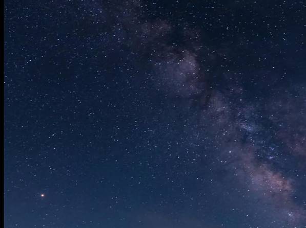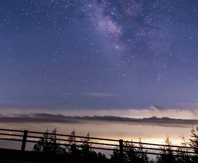 夜幕低垂,天空变成了一块深蓝色的天鹅绒画布,星星从幕后走向台前,如闪闪发光的碎钻撒满天空,肉眼清晰可见绵长的银河倾泻至地平线。天穹如镜般透彻,营造出一种神圣的静谧感,如果用延时拍摄的话,还能看到斗转星移的星轨。