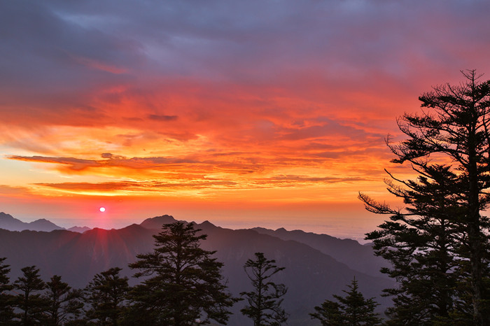 看着云彩一点点被染上金黄,蔓延开来,半边天空的云越来越红,远处的蒸腾云海和黛绿群山,近处的房屋、栈道、树木、人,都被披上了一层金色的光芒,太阳终于像弹力球一样从云层中蹦出来,整个西岭沐浴在一片金色光辉之中……