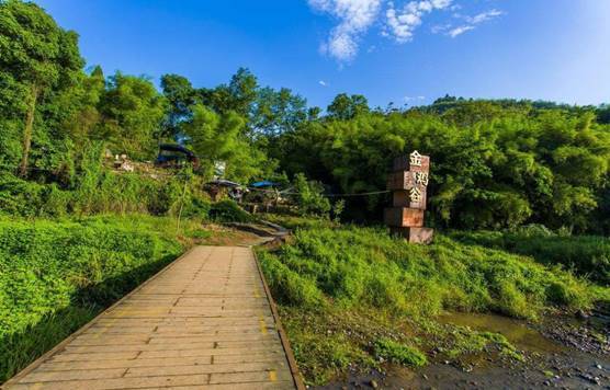 平乐金鸡谷位于邛崃市平乐古镇的白沫江上游,谷内有万顷竹海、高空吊桥、山体壁画和玻璃栈道,其山川之俊朗、怪石之突兀又与西岭雪山不同。