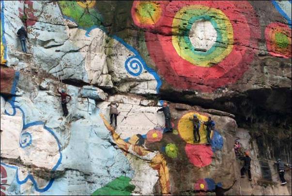 继续向走,到了攀岩的地方,这里被称为西南首条“铁道式攀登”户外运动项目,岩壁陡峭,只够放半个脚掌,继续前行是一场身体与毅力的拉锯战。岩壁上的彩色壁画,给攀岩的惊险紧张之旅增添了几分轻松的乐趣。