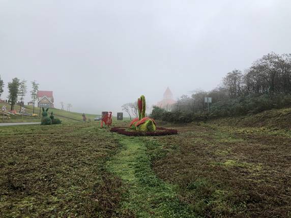 下午飘起了蒙蒙细雨雨,雨下的并不是很大,但是空气里的湿度却很粘稠,这样的雨雾天气与其说是扫兴不如说是一场奇遇。整个二平台都在一场烟雨缥缈之中,笼罩着一层迷离,不远处的度假酒店隐约能看见耸立的塔尖和梦幻般的玫红色,如果忽略身边拥挤的人群,就好像进入了一场童话梦境一样,我们猝不及防的就闯入了迷雾森林。