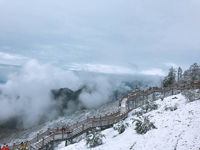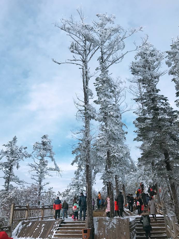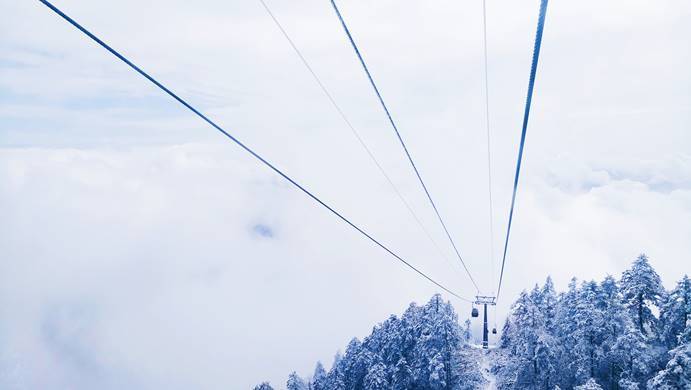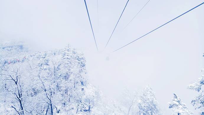 坐缆车去往三平台,雪景在脚下不断的更迭,树顶的全部附上了一层白色,除了惊呼就是哇撒。伴随着咔嚓咔嚓的不停拍照,大家都享受着在云层间不断穿行,整个世界都白茫茫一片的那种刺激感。