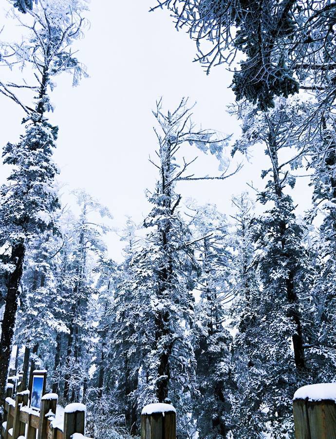 木质的栈道和笔直冷杉木显得和谐无比,皑皑的雪无声的覆盖住所有生灵,冰天雪地里有一种无言的绝美,就像红楼梦的末章里写道的那样:好一似食尽鸟投林,落得个白茫茫大地真干净。