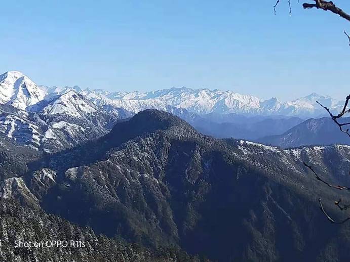 树顶落满了洁白松软的雪,正如老舍书中所描写的那样:山上的矮松尖儿上顶着一髻儿白花,显得松树枝越发青黑,山坡上的草色与雪色黄白相间,仿佛给群山穿上了一件带水纹的花衣。