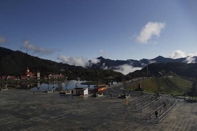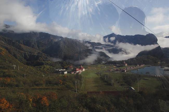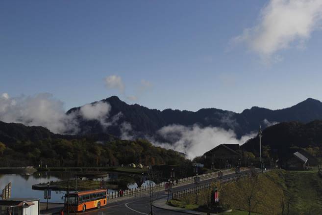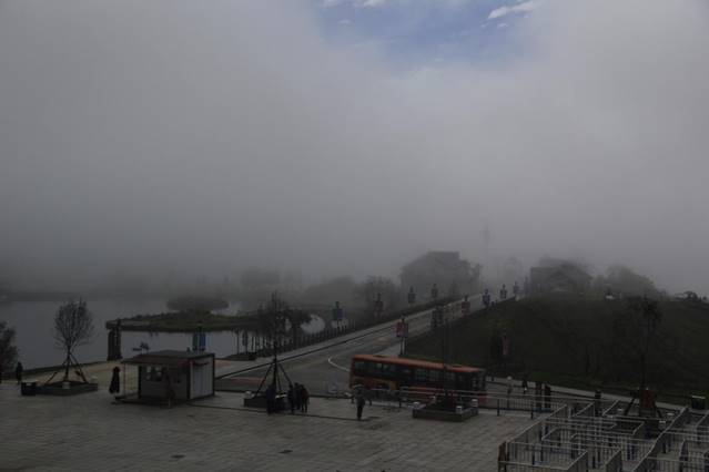 在游客中心便开始形成,在二平台映雪广场弥漫开来,滞留在海拔三千多米的日月坪的山谷间,形成一片云海。