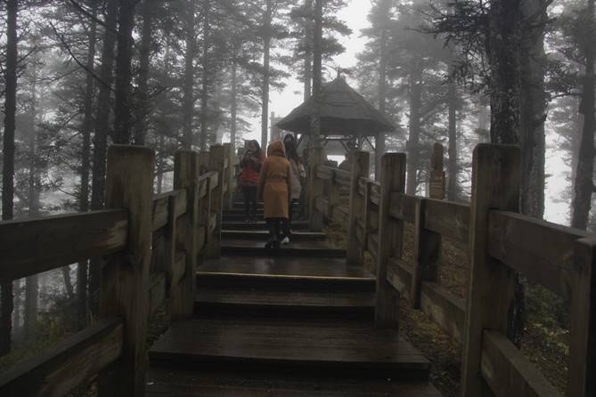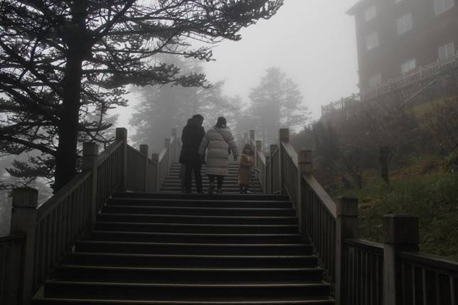 乘着缆车往山上走,雾越来越浓,到了日月坪,已是一片白雾茫茫了。