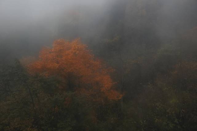 越往上走,雾气越浓,山间红叶此时还未完全褪下红妆,朦胧飘渺,恍若“雾里看‘花’”。