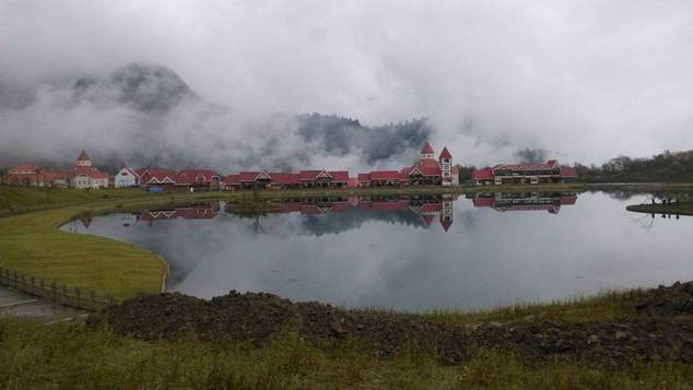 清晨推开窗,映雪广场笼罩在一片轻雾之中,水汽在映雪湖蒸腾,形成一层笼盖视野的薄纱。水雾缥缈间,远处的山峦、树林,近处的红枫叶和尖顶红房子,在雾气中若影若现,如梦如幻,纯净柔白似轻纱飘絮,这才是雾应该有的味道啊。