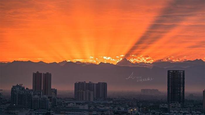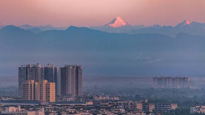 太阳从地平线上冒出头来,天空渐渐被染上了金黄色,成都西边雪山连绵,雪白的山顶从云雾中冒出头来,映衬着天空中的朝霞,着实是一幅美轮美奂的画卷。
