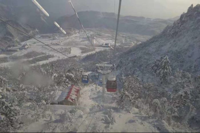 一大早我们便开始出发前往日月坪,坐观光去往日月坪得坐观光索道,索道落差1000米,属亚洲落差最大的索道,它将海拔3250米的日月坪景区与滑雪场联为一体,一路往上,仿佛在冰雪与云雾中穿行。