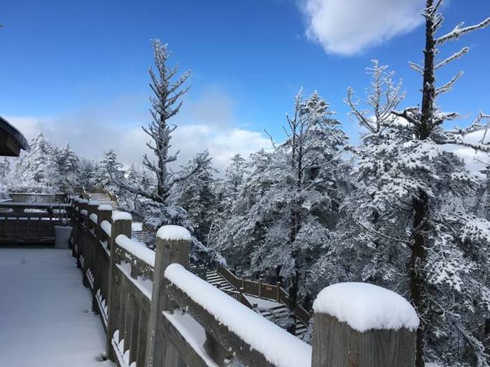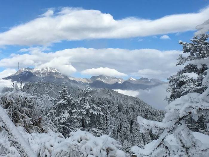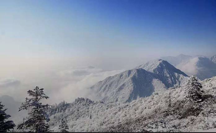 越往上,雪越厚,到了日月坪,我们反而可以看见另一番景象。和滑雪场的美不同,日月坪的美是一种震撼人心之感,眺望远处,白雪皑皑的雪山俨然屹立,冰霜遍野的大地充满生机。云海、雪原、森林、霜花,描绘出了一幅气势磅礴的画卷。