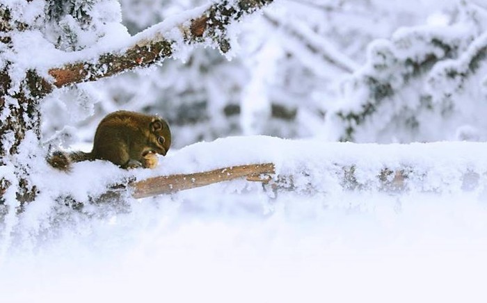 沿着木栈道往里走,这里无疑是摄影爱好者的天堂,巍峨的雪山,林间几只上蹿下跳的小松鼠,高矮参差的树木,栈道、岩石、村舍,都是可以取景入镜的素材,远端一片树林的全景,近处几条树枝的特写,霜花的表现手法虚虚实实,每个人有每个人心中最美的瞬间。