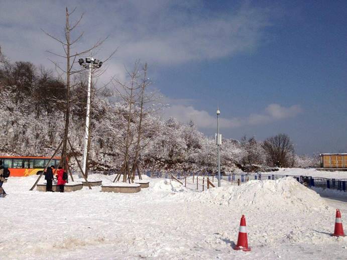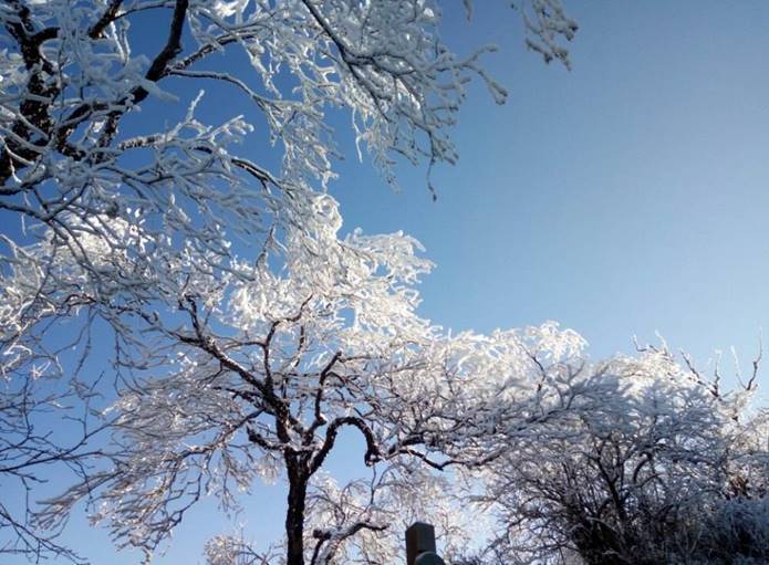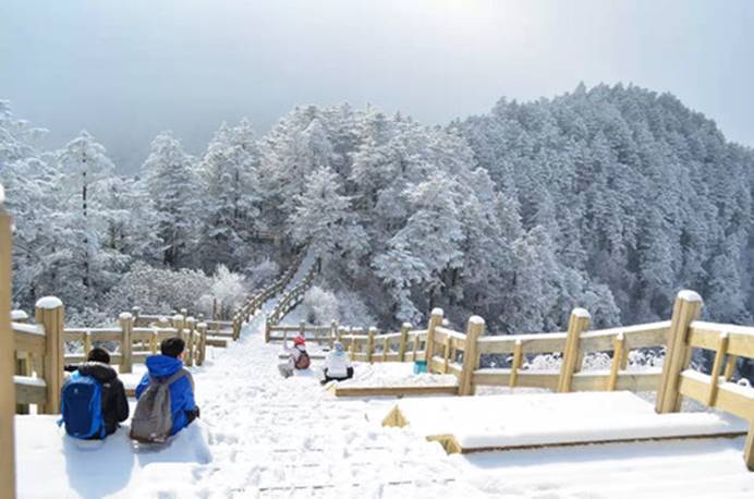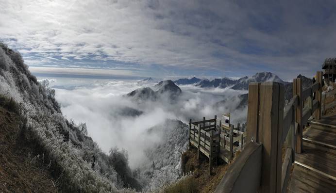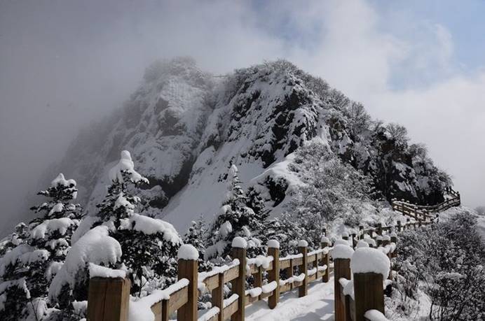 第二天,我们坐着缆车上到日月坪,随着缆车上升我的眼前豁然开朗,看着群山从低矮到雄伟,看着天空从雾霾到清澈,空气也变得越来越冷。下了缆车后,首先映入眼帘的是一条长廊,宛如天上的仙桥般神秘,云海、长廊美不胜收。只见天地之间白茫茫的一片,雪花纷纷扬扬的飘落下来,四周像拉起了白色的帐篷,大地变得银装素裹,让我不禁想起唐代诗人岑参的“忽如一夜春风来,千树万树梨花开”。
