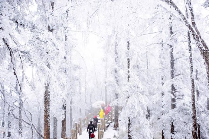 从成都到雪山的车程大概两个小时左右,我们一路向前,阳光穿透雪林,落在铺满雪的木板栈道上。微暖的触感,经树林和冰雪折射的阳光,更是让林间步道,多了一分梦幻的味道。伴随着气温的下降,凝结的霜花挂在西岭雪山的浩浩林海中,变成了美轮美奂的树挂。我感觉自己置身在一场冰雪童话里,让人感叹不已!