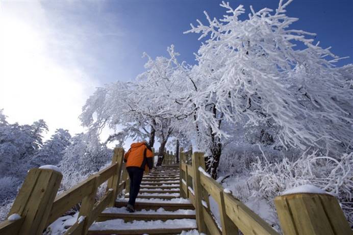沿着木栈道往上走,周围只有雪簌簌而落的声音,道路两旁的树枝挂满了洁白晶莹的霜花,阳光下粉妆玉琢,银丝闪烁,景色既野又美。