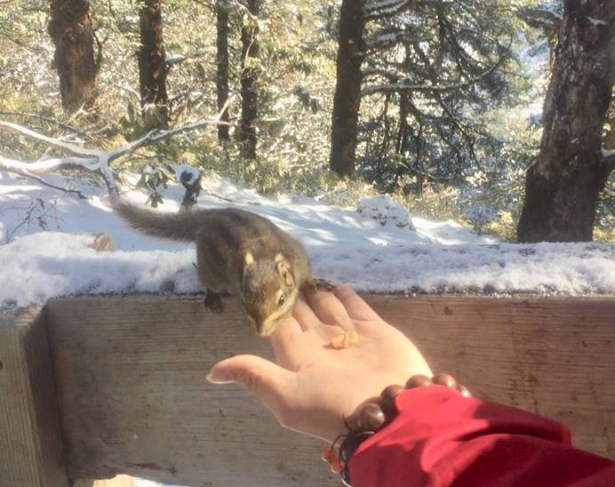 林中不时蹿出小松鼠出来觅食,一起一落间抖落树枝的雪花,落到行人一头一身。小松鼠在夏季光滑鲜亮的黑褐毛色到了冬季变成绵密蓬松的深灰色,亮晶晶的眼睛,像噙着眼泪,我们把把坚果,小饼干放在手心,它轻轻的走过来,温凉绵软的小爪子小心翼翼的搭在手心,心瞬间被这呆萌的小东西融化了,很想摸一摸它绵软的皮毛,又怕惊走了它。