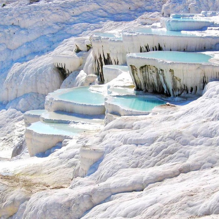 棉花堡是土耳其闻名的温泉度假胜地,这里有上千年的天然温泉,更有古怪的好似棉花一样的山丘。有的山丘雪白如棉花,有的层次分明像梯田,雪白中泛着蓝光,特别漂亮。