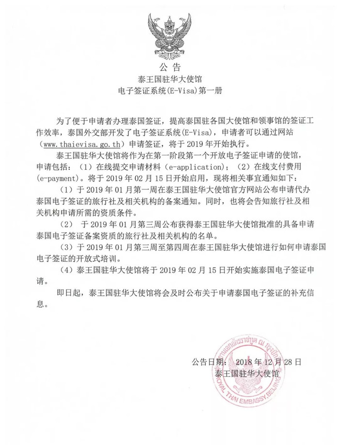 (1)于2019年01月第一周在泰王国驻华大使馆官方网站公布申请代办泰国电子签证的旅行社及相关机构的备案通知。同时,也将会告知旅行社及相关机构申请所需的资质条件。