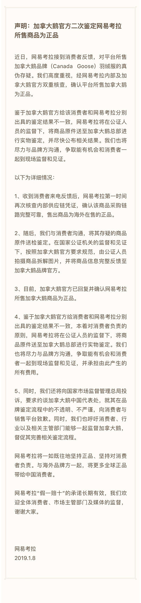 1月8日,网易考拉在其官方微博上称,经过内部及加拿大鹅官方双重核查,确认平台所售加拿大鹅为正品。