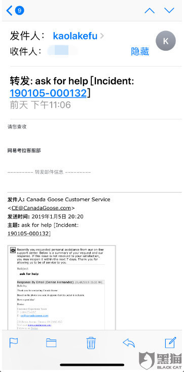 缐女士第一次向加拿大鹅寻求鉴定的邮件(图片来源:微博截图)