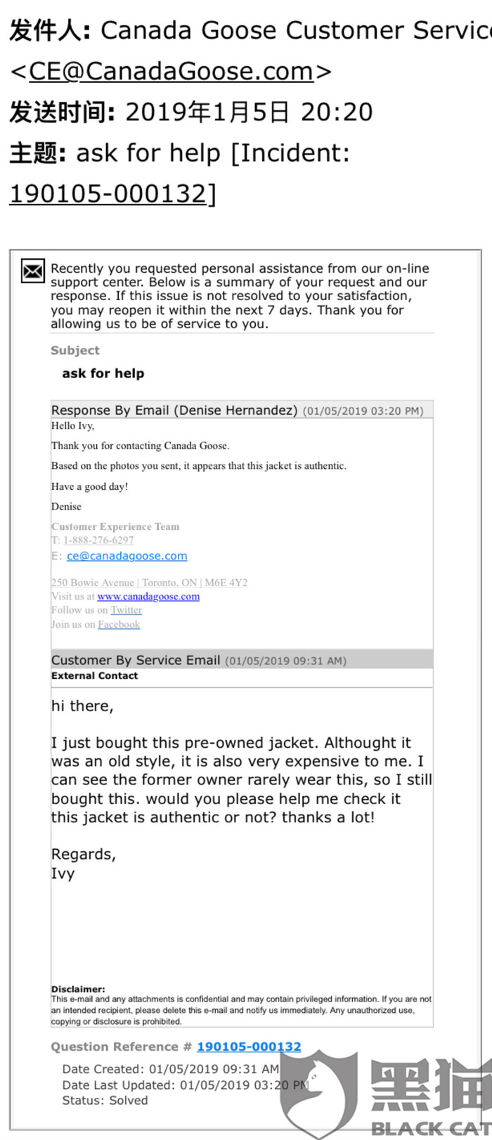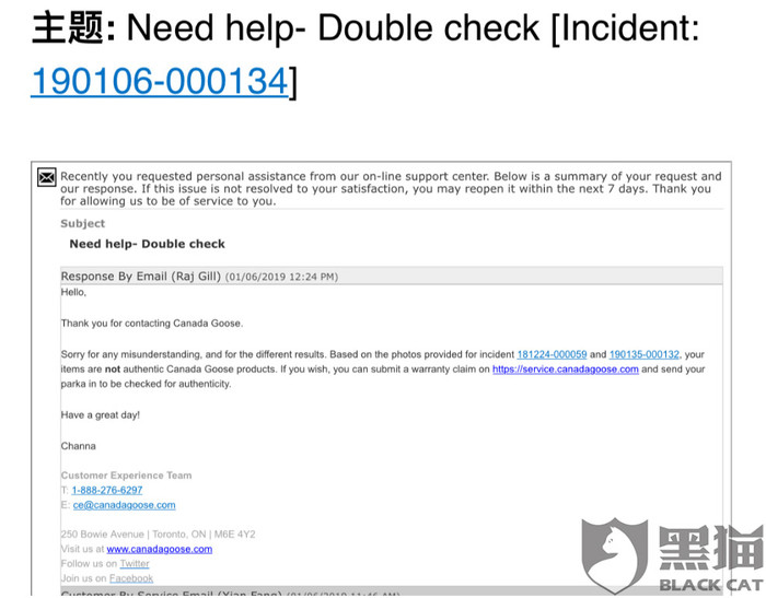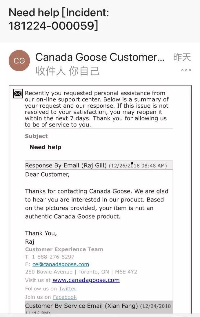 在这之后,缐女士立刻与加拿大鹅再次确认为何同一商品会有不同鉴定结果,加拿大鹅官方马上道歉,并回复经再次鉴定两个结果均为非正品。